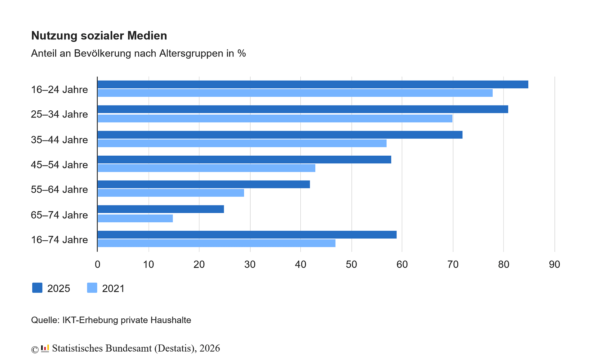 Für die Bevölkerung zwischen 16 und 74 Jahren gilt: Je jünger die Menschen sind, desto eher nutzen sie aktiv soziale Medien. Am höchsten war der Anteil im Jahr 2025 demnach bei den 16- bis 24-Jährigen mit 85 %. Bei den 25- bis 34-Jährigen betrug er 81 %, bei den 35- bis 44-Jährigen noch 72 %. Mit zunehmendem Alter geht die aktive Nutzung sozialer Medien weiter zurück; von den 65- bis 74-Jährigen war noch ein Viertel (25 %) in den sozialen Medien aktiv.