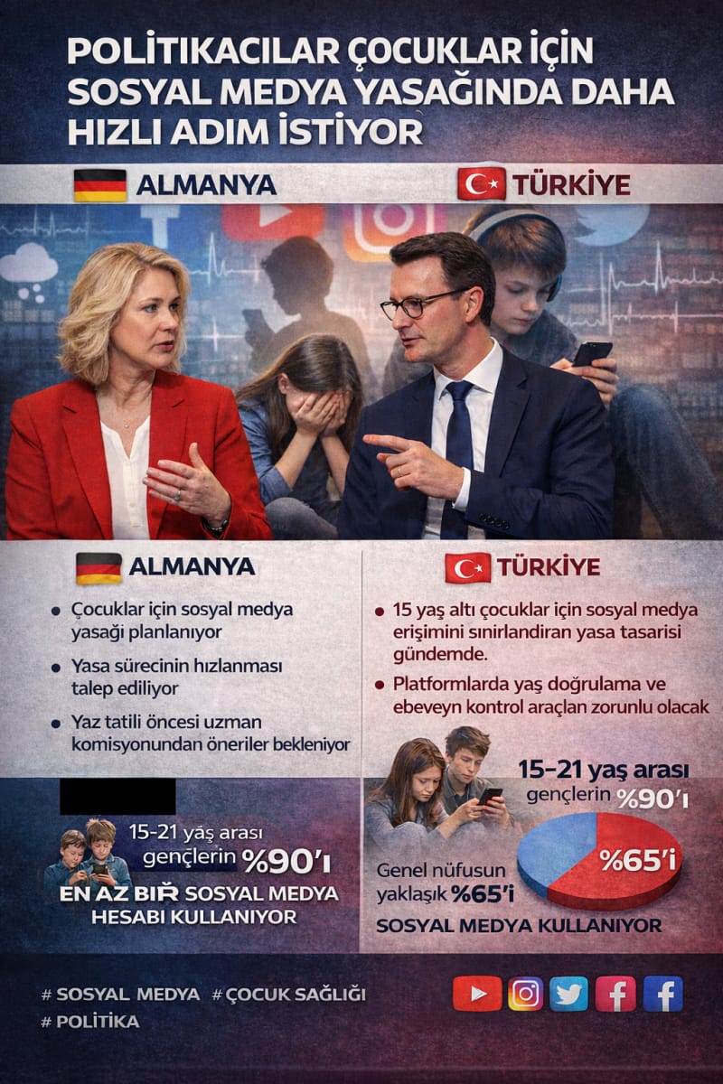 Berlin’de giderek artan politik baskı, hükümetin çocuk ve gençler için sosyal medya yasağını hayata geçirme hızını artırmasını hedefliyor. SPD’li Schwesig, “Yaz ayını beklemek anlamlı değil, elimizde yeterli veri ve deneyim mevcut” ifadelerini kullandı.