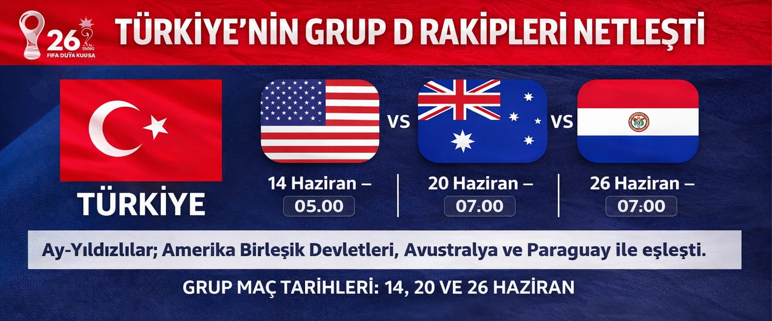 Türkiye, 2026 FIFA Dünya Kupası Grup D’de Amerika Birleşik Devletleri, Avustralya ve Paraguay ile eşleşti. Ay-yıldızlı ekip, grup aşamasındaki maçlarını 14, 20 ve 26 Haziran tarihlerinde oynayacak. ABD karşılaşması sabah 05.00 civarında, Avustralya ve Paraguay maçları ise sabah 07.00’de başlayacak. Türkiye, grup kadro değerleri bakımından 440 milyon euro ile en değerli takım konumunda bulunuyor. Bu, hem takımın finansal gücünü hem de kadro derinliğini gösteriyor. Grubun diğer takımları ise Amerika Birleşik Devletleri 357 milyon euro, Paraguay 144 milyon euro ve Avustralya 51 milyon euro kadro değerine sahip.